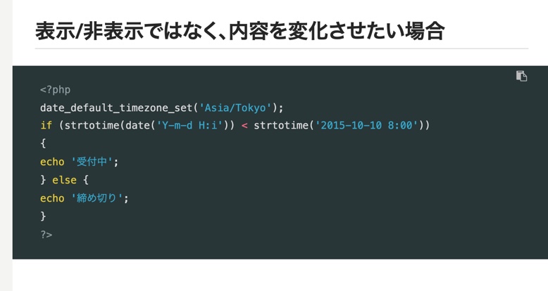 <?//sp if (( strpos($ua, ‘iPhone’) !== false) || ( strpos($ua, ‘iPod’) !== false ) || (strpos($ua, ‘Android’) !== false )) {?> <center> <?php date_default_timezone_set(‘Asia/Tokyo’); if (strtotime(date(‘Y-m-d H:i’)) < strtotime(‘2022-01-01 00:00’)) {?> <img src=”images/top/20211231.jpg” alt=”” style=”margin-top:10px; max-width:100%;”> <?} else {?> <img src=”images/top/20220101.jpg” alt=”” style=”margin-top:10px; max-width:100%;”> <?}?> </center><? } else { ?> <?//PC ?> <center> <?php date_default_timezone_set(‘Asia/Tokyo’); if (strtotime(date(‘Y-m-d H:i’)) < strtotime(‘2022-01-01 00:00’)) {?> <img src=”images/top/20211231.jpg” alt=”” style=”margin-top:10px;”> <?} else {?> <img src=”images/top/20220101.jpg” alt=””> <?}?> </center><? } ?>